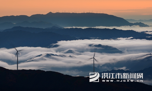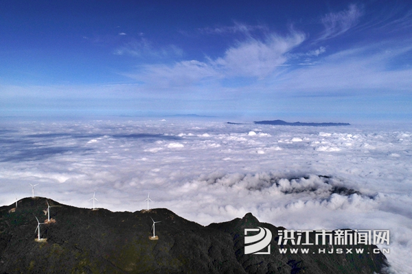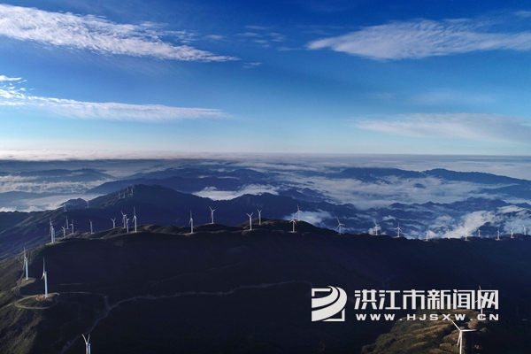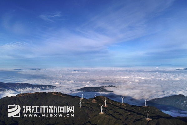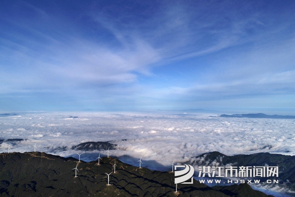 10月19日,雪峰山苏宝顶出现云海景观,雾气缭绕,笼罩山峰,与数十台风能发电机交相呼应,景色迷人。