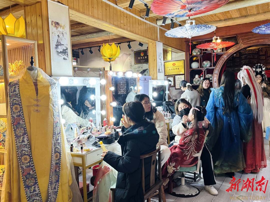 不大的店面里,挤满了慕名而来的游客。精美汉服搭配珠钗、团扇、油纸伞等古风配饰,满目皆是国风雅致。店员们从换装、盘发到上妆、配饰,全程忙得应接不暇,镜子前挤满了年轻人。