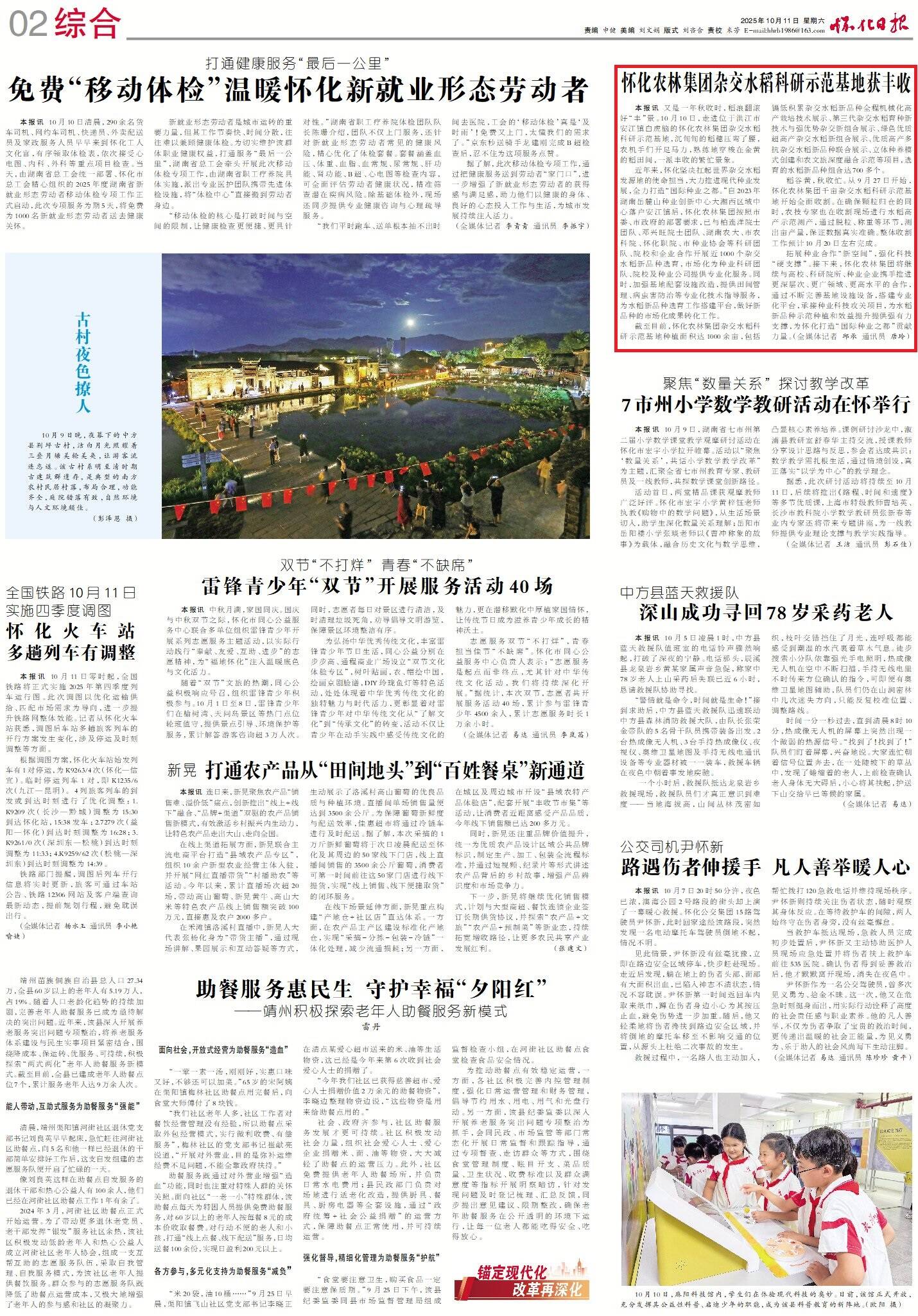截至目前,怀化农林集团杂交水稻科研示范基地种植面积达1000余亩,包括镉低积累杂交水稻新品种全程机械化高产栽培技术展示、第三代杂交水稻育种新技术与强优势杂交新组合展示、绿色优质超高产杂交水稻新组合展示、优质高产多抗杂交水稻新品种联合展示、立体种养模式创建和农文旅深度融合示范等项目,选育的水稻新品种组合达700多个。
