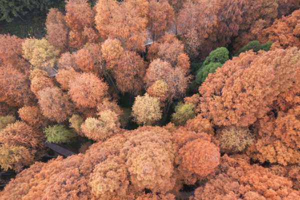 (12月,靖州苗族侗族自治县排牙山国家森林公园,千亩水杉红了,吸引各地游客前来观赏游玩。 田其珍 摄)